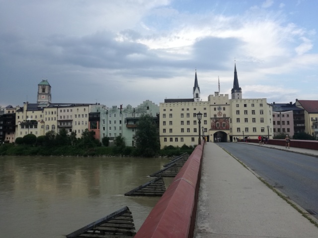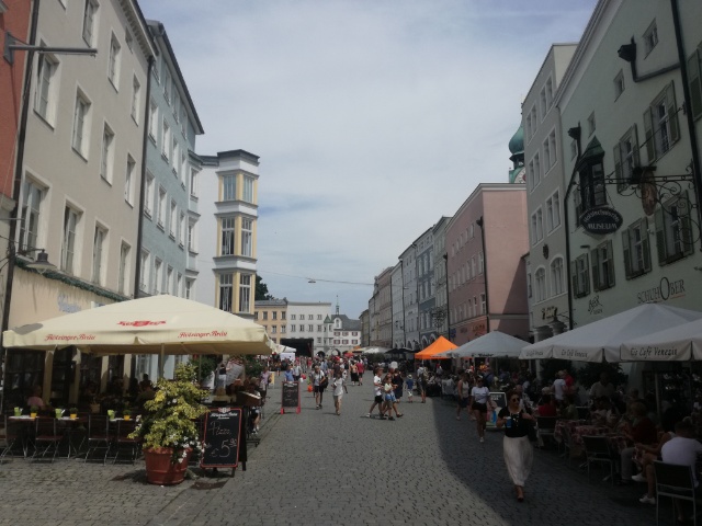 Naja es waren dann gesamt doch etwas mehr aber es schmeckt einfach unfassbar gut. Mit der Wirtin dann noch länger geplaudert und gegen 9 Uhr erst aufgebrochen. Es wird ein ruhiges nach Hause rollen. Das Wetter zeigte sich perfekt zum Radeln heute. Sonne begleitet mich bis zum Tagesziel, dazu leichter Wind, erstmals von vorne, aber kaum erwähnenswert. Den Innradweg kann man auf beiden Seiten fahren und es macht es dann auch interessant einmal auf die andere Seite zu wechseln. Über Kufstein ging es dann weiter nach Deutschland bis nach Rosenheim. Nein ich habe sie nicht gesehen die Rosenheim Cops oder wie diese Vorabendserie im Fernsehen auch heißen mag. In Rosenheim ist Stadt fest und echt toll was los. Straßenkünstler treten im Wechsel auf, die Lokale waren rausgeputzt. Eine schöne Stadt mit vielen alten Häusern sehr hübsch renoviert. Also eine sehr nette Stadt. Nach einer Pause bei Kaffee und Getränk, ging es dann auf die letzten 30 Kilometer des heutigen Tages. Auf dem fein gekiesten Weg ging es auf dem Damm dahin. In meinem Rücken türmen sich die Wolken langsam zusammen bauten eine Regenfront auf. Nach ein paar kleineren Anstiege auf der rechten Innseite dann in Wassburg gelandet. Da ist heute Weinfest und die ganze Innenstadt ist eine Feierzone. Alle Lokale haben aufgebaut, Musik spielt in allen Gassen. Und ich mitten drinnen, mit einem Zimmer in den Innenhof und somit eine ruhige Nacht möglich.
