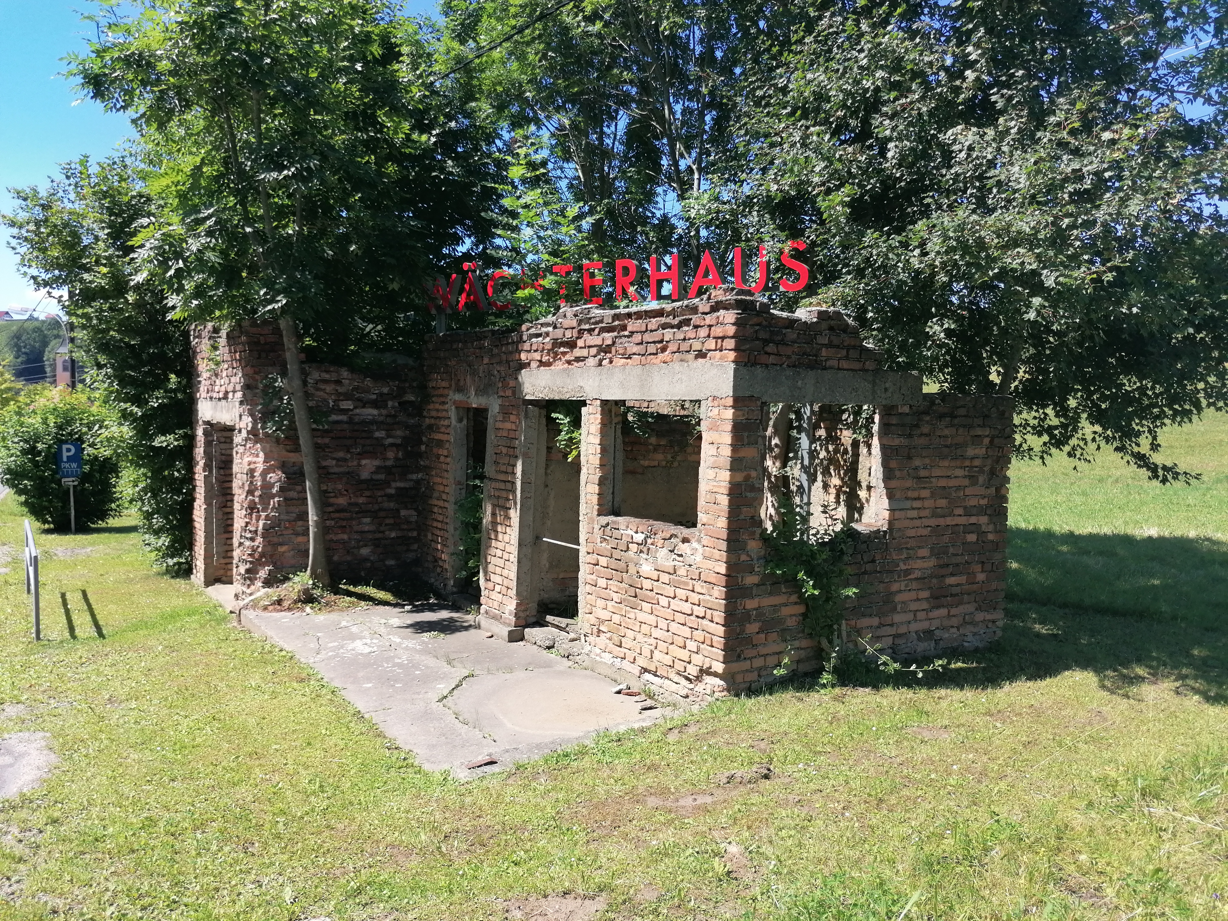 Auffällig wenn auch klein sind, Richtungsschilder den Weg zum ehemaligen Lagergelände und der Gedenkstätte weisen angebracht. Beim ehemaligen Gelände dann einen Tafel und ein paar Meter dann die Gedenkstätte.