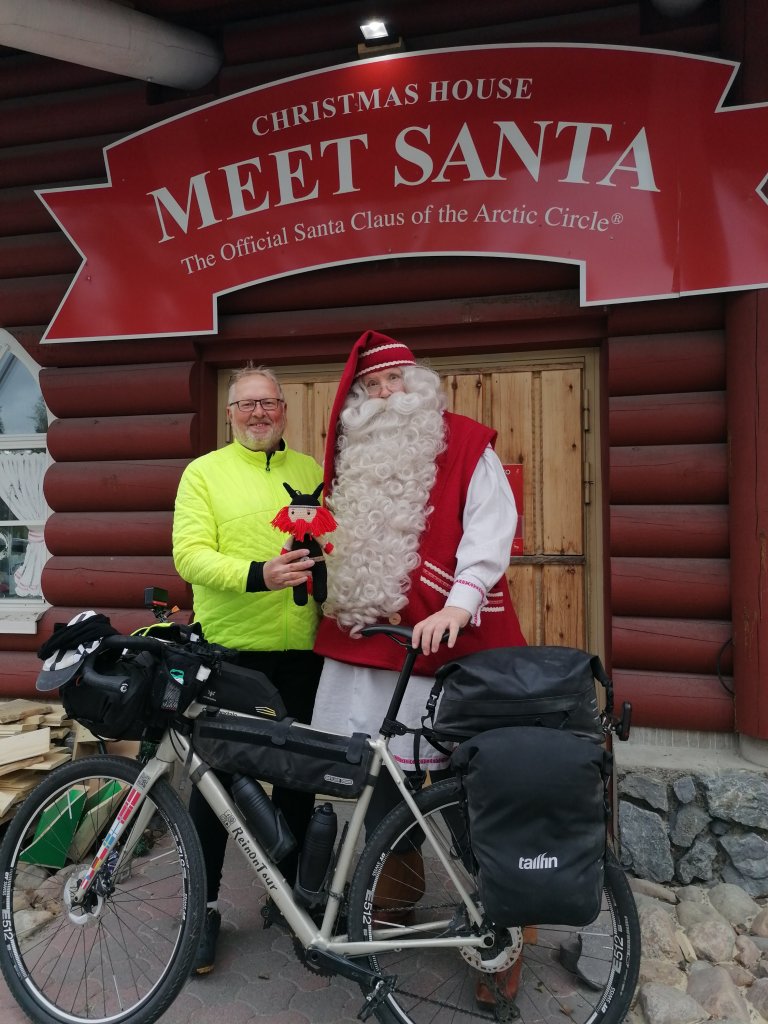 Die Hoffnung das es wärmer wird hat sich bei Tag 29 der gleich am Morgen zerschlagen. Der Regen ist abgeklungen aber die Kälte blieb. Heute auch Überhose angezogen und lange Handschuhe. Regenhaube für Helm das es nicht zieht und das Schlauchtuch musste ebenfalls angezogen werden. So ging es zum Santa Claus Village. Das Treffen Nordmann Weihnachtsmann war einfach nur toll. Der Weihnachtsmann spricht deutsch. Dann dürfte ich noch ein Selfie machen und ein Foto mit Rad und Nordmann vor seinem Haus. Ein tolles Erlebnis den Herren einmal persönlich zu treffen. So manche Geschenke aus Kindertagen wollte ich bei dem Treffen nicht hinterfragen.
